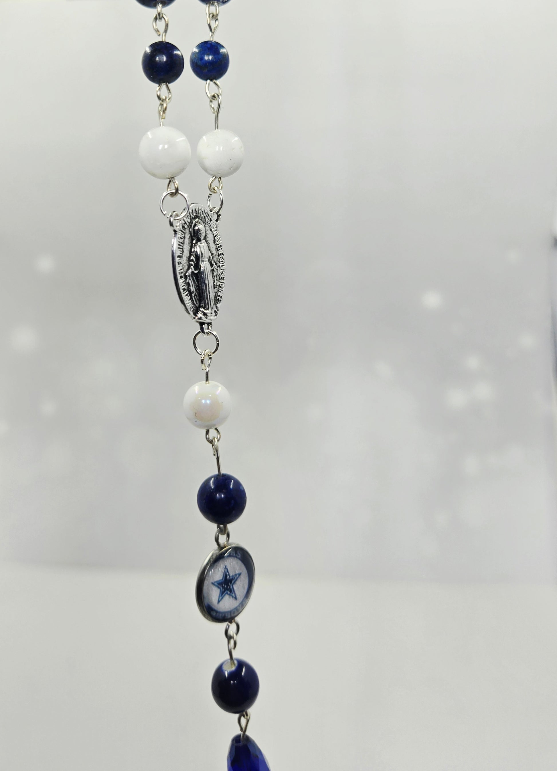 This hand-linked rosary features semi-precious stones in navy blue and white with silver plated links and silicone football accents.
