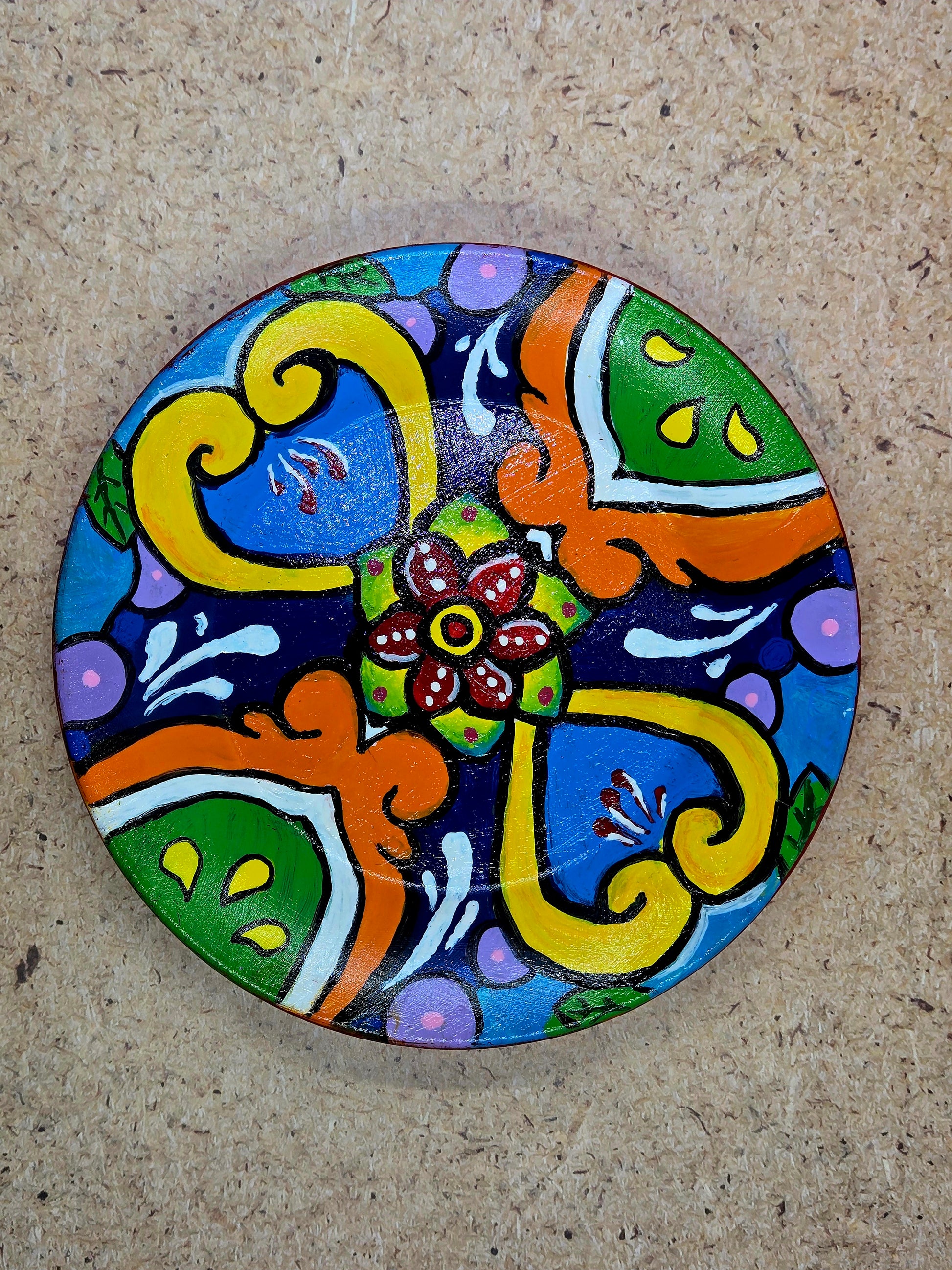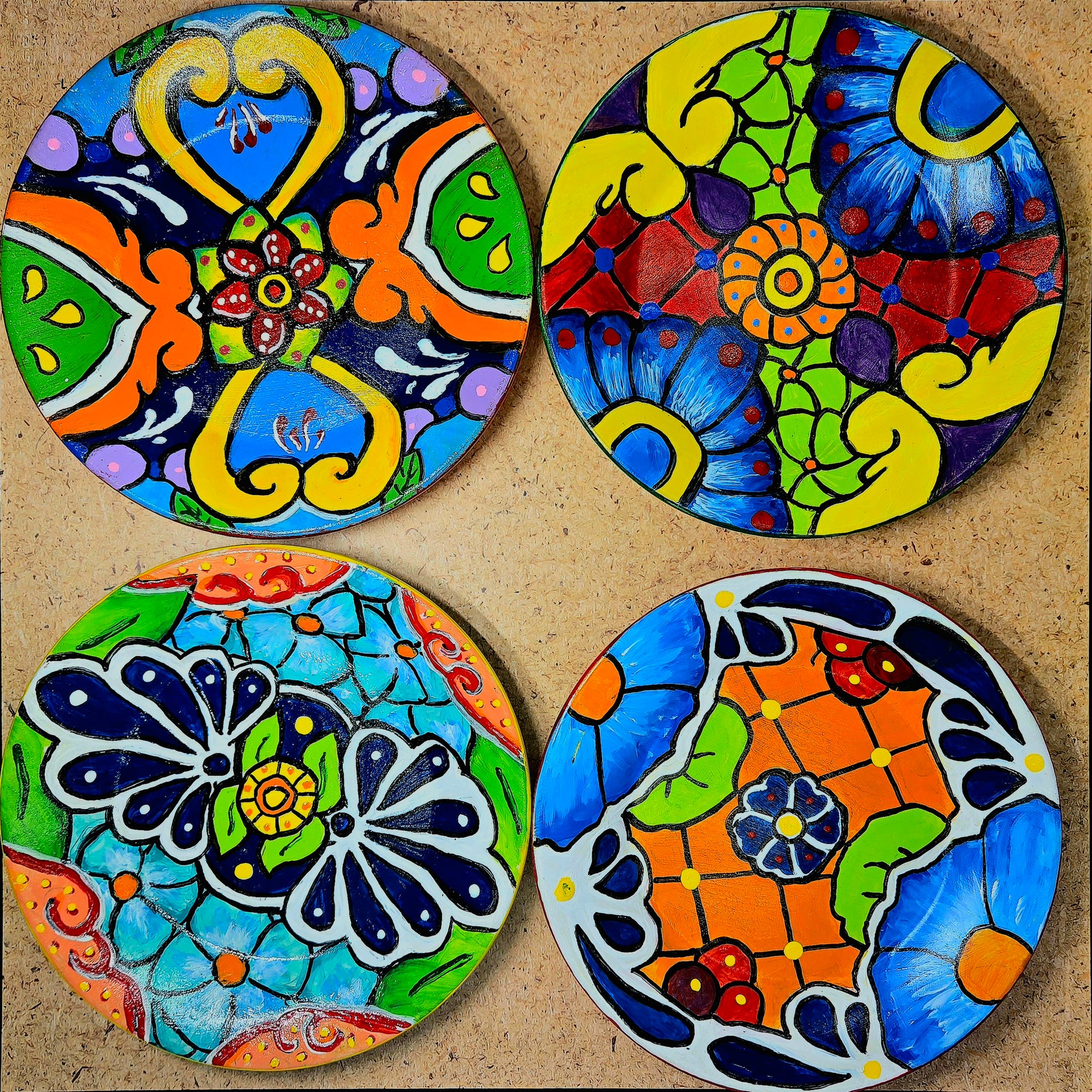 These talavera inspired colorful decorative plates are 100% hand painted. Each measures approximately 7 inches in diameter. Set of 4.